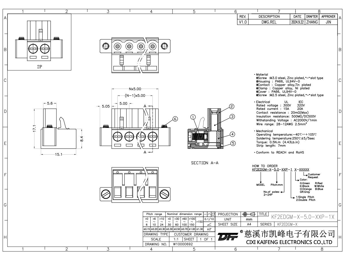 Pluggable Terminal Block MATERIAL:M3.0 Steel Galvanized ,"一"slot typecontact: -Pin header:-Housing: PA66,UL94V-0ElectricalULIECRated voltage300V 320V Rated current15A20AContact resistance20mΩInsulation resistance500MΩ/DC500VWithstanding voltage AC2000V/1minWire range28-12AWG 2.5㎜2MechanicalTemp.rang-40℃~+105℃ Max.soldering+