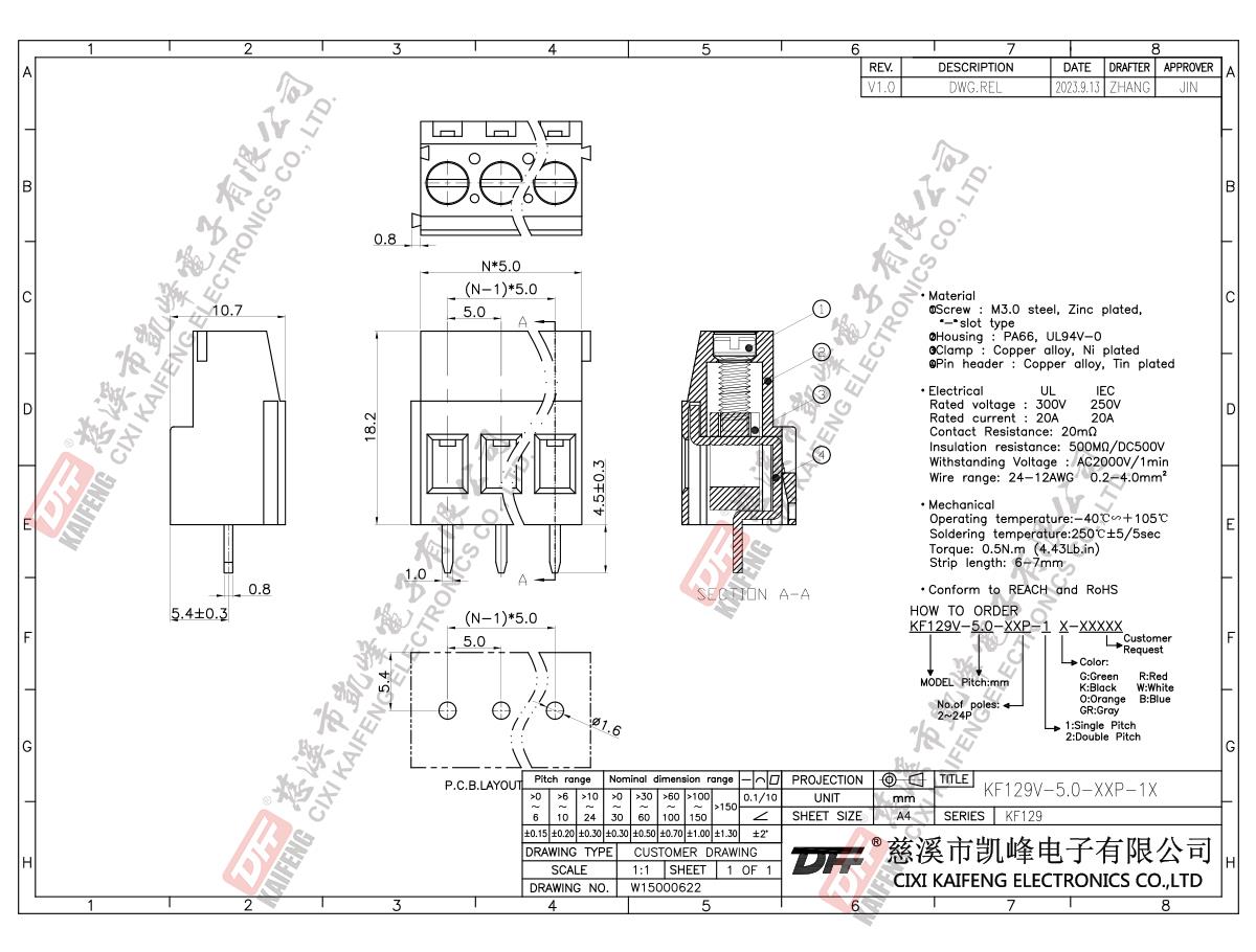 PCB Terminal Block MATERIAL:Screws:M3steel,Ni platedContact material:BrassPin header:Brass, Tin platedHousing:PA66UL94V-0·MechanicalTemp.rang:-40℃~+105℃Max.soldering:+250℃5S torque:0.4Nm(3.6lb.in)Strip length:6-7mm·ELECTRICALRated voltage:300VRated current:20AContact resistance:20m?Insulation resistance:5000M?\1000VWithstanding voltage :AC1500V\1MinWire range:24-12AWG2.5mm2
