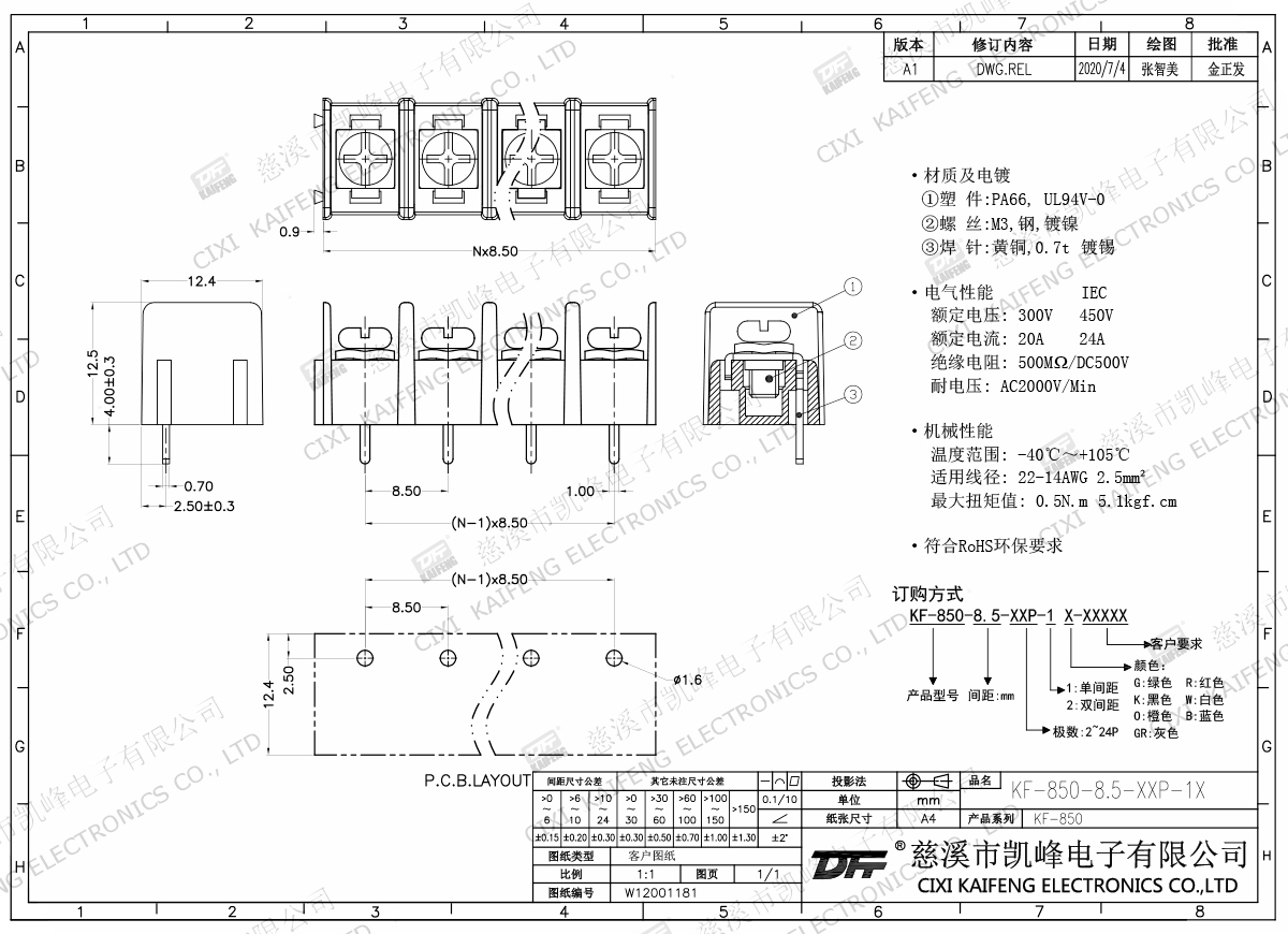 Material:M3.0 Steel,Ni platedTerminal:Brass,0.7t Ni platedHousing: PA66,UL94V-0ElectricalULIECRated voltage300V 450V Rated current20A24AInsulation resistance500MΩ/DC500VWithstanding voltage AC2000V/1minWire range22-14AWG 2.5mm2MechanlicalTemp.rang-40℃~+105℃ Torque0.5N.m 4.4Lb.in