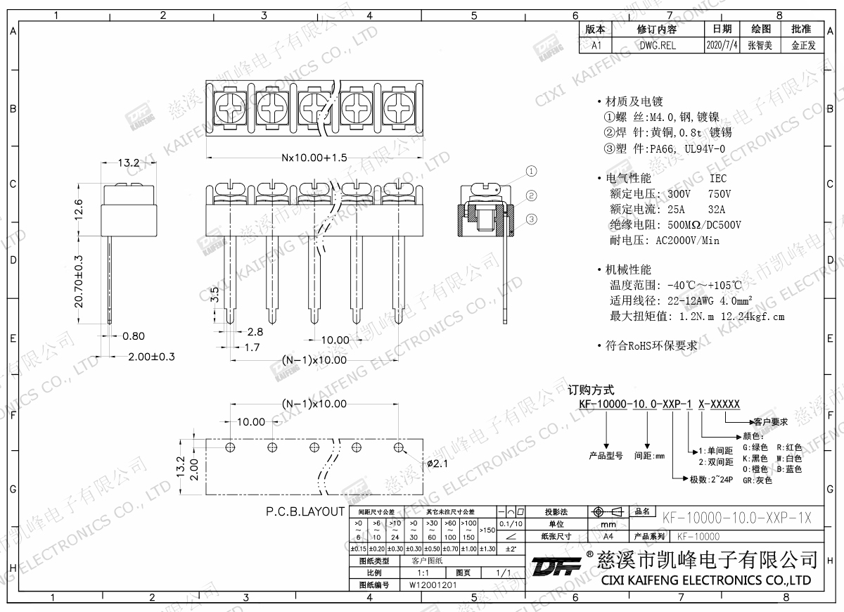 柵欄式接線端子 材質(zhì)電鍍:M4.0 鋼,鍍鎳端子:黃銅,0.8t 鍍鎳塑件: PA66,UL94V-0電氣性能ULIEC額定電壓300V 750V 額定電流25A32A絕緣電阻500MΩ/DC500V耐電壓AC2000V/1min使用線徑22-12AWG 4.0mm2機械性能溫度范圍-40℃~+105℃ 扭矩1.2N.m 10.53Lb.in