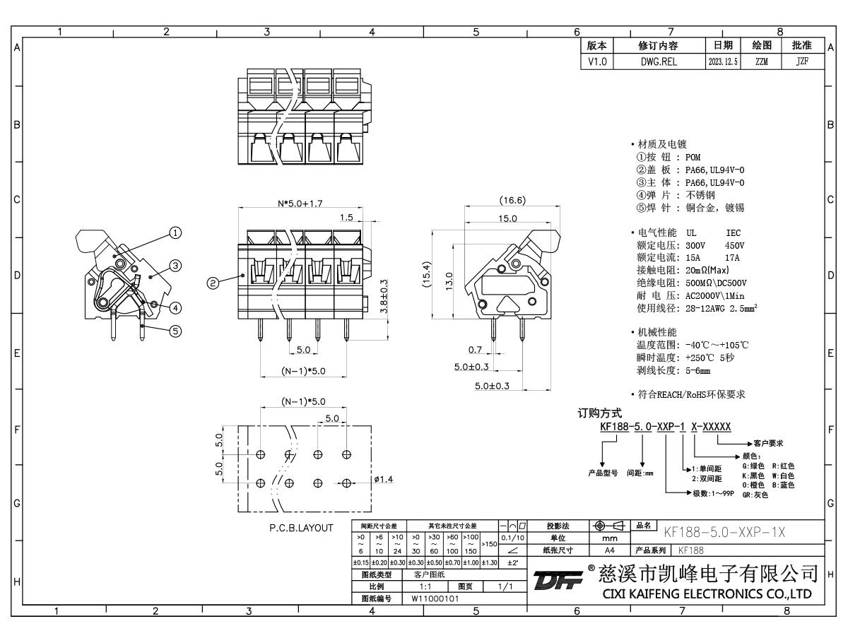 免螺絲式接線端子 材質(zhì)電鍍:①按鈕:PA66,UL94V-0②蓋板:PA66,UL94V-0③主體:PA66,UL94V-0④彈片:不銹鋼⑤焊針:黃銅,鍍錫電氣性能ULIEC額定電壓300V 450V額定電流15A17A接觸電阻20mΩ絕緣電阻500MΩ/DC500V耐電壓AC2000V/1min使用線徑28-12AWG 2.5mm2機械性能溫度范圍-40℃~+105℃