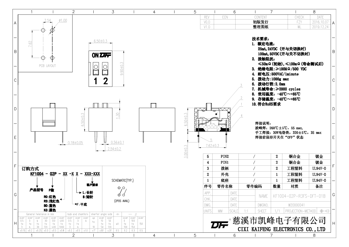 撥碼開關(guān) 材質(zhì)電鍍:UL94V-0 工程塑料,黑色 上蓋:UL94V-0 工程塑料,紅色 藍(lán)色 黑色 推鈕:UL94V-0 工程塑料,白色端子:磷青銅鍍金 電氣性能電氣壽命:在電壓24VDC電流25mA之下測試,可來回?fù)軇?000次開關(guān)不常切換的額定電流:100mA,耐壓50VDC開關(guān)經(jīng)常切換