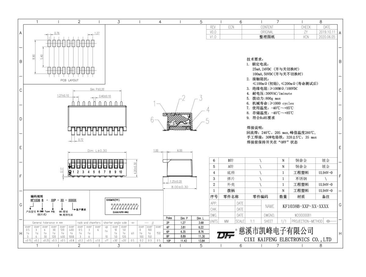 撥碼開關(guān) 材質(zhì)電鍍:25mA,24VDC開關(guān)不切換的額定電流100mA,50VDC接觸電阻初始值≤100mΩ測試后≤200mΩ絕緣電阻≥100mΩ/100VDC耐電壓300VAC/1min撥動力800g/Max機(jī)械壽命≥1000cycles使用溫度-40℃~+85℃儲存溫度-40℃~+85℃材質(zhì)說明外殼工程塑料,黑色底座工程塑料,黑色撥柄工程塑料,白色PIN針磷青銅鍍金焊
