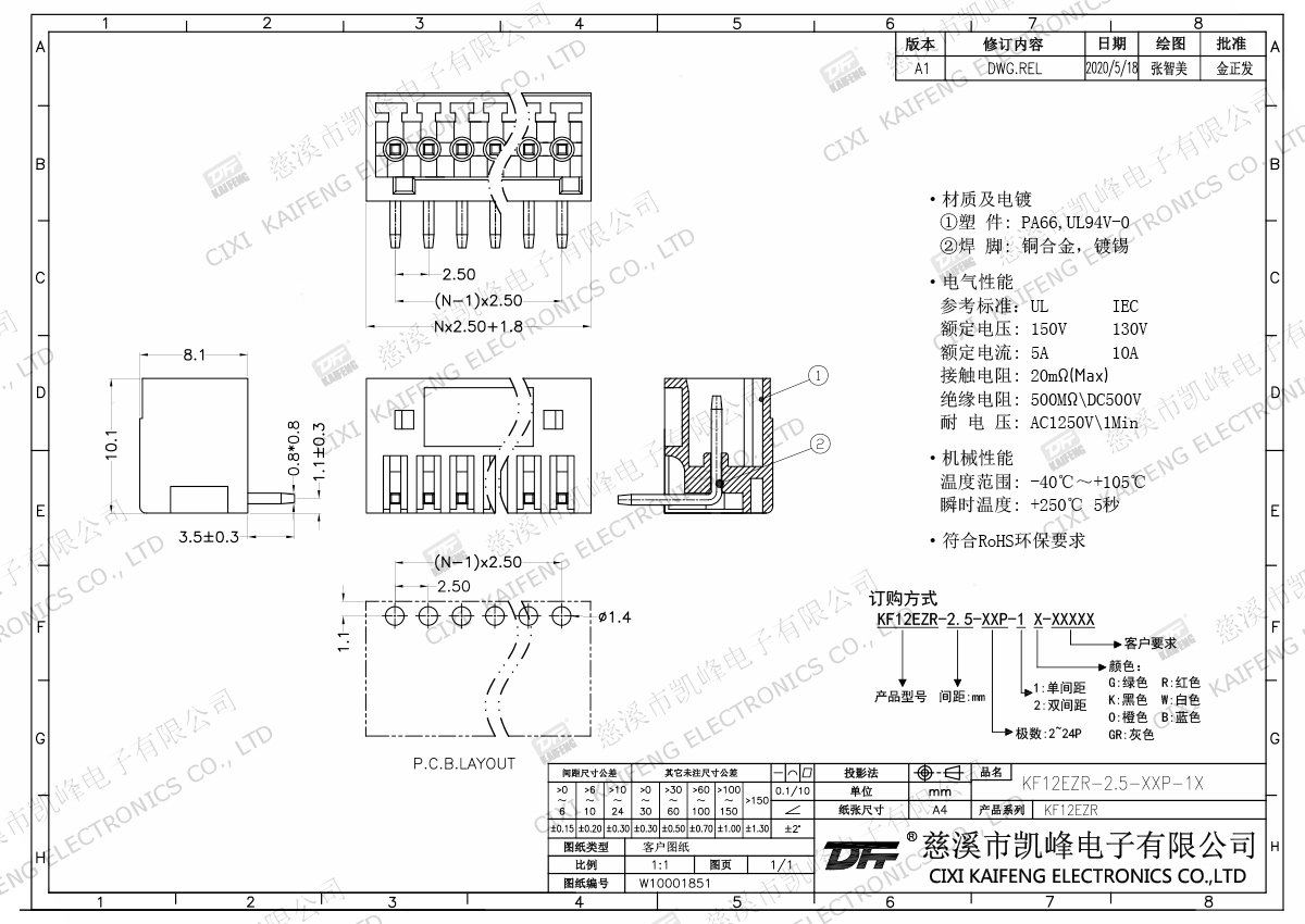 插拔式接線端子 材質(zhì)電鍍:觸點: -焊針: 黃銅,鍍錫塑件: PA66,UL94V-0電氣性能ULIEC額定電壓150V 130V 額定電流5A10A接觸電阻20mΩ絕緣電阻500MΩ/DC500V耐電壓AC1250V/1min使用線徑-機械性能溫度范圍-40℃~+105℃ 瞬時溫度+250℃,5sec扭矩-剝線長度-