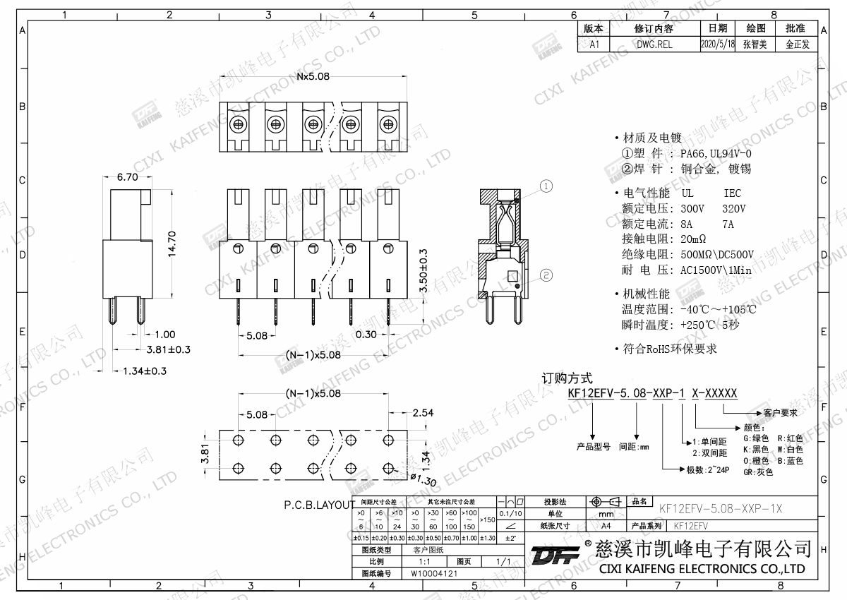 插拔式接線端子 材質(zhì)電鍍:觸點: -焊針: 磷青銅,鍍錫塑件: PA66,UL94V-0電氣性能ULIEC額定電壓300V 320V 額定電流8A7A接觸電阻20mΩ絕緣電阻500MΩ/DC500V耐電壓AC1500V/1min使用線徑-機(jī)械性能溫度范圍-40℃~+105℃ 瞬時溫度+250℃, 5sec扭矩-剝線長度-
