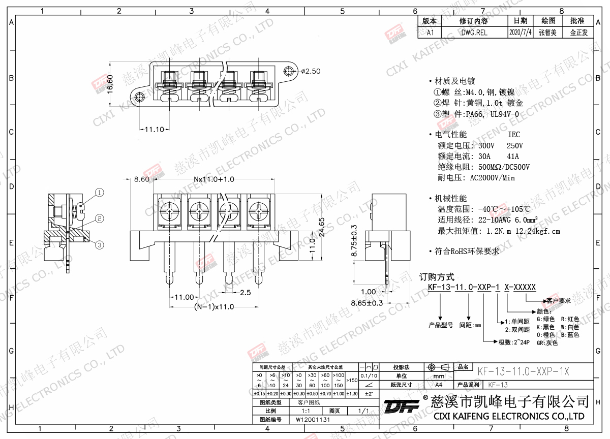 柵欄式接線端子 材質(zhì)電鍍:M4.0 鋼,鍍鎳端子:黃銅,1.0t 鍍鎳塑件: PA66,UL94V-0電氣性能ULIEC額定電壓300V 250V 額定電流30A41A絕緣電阻500MΩ/DC500V耐電壓AC2000V/1min使用線徑22-10AWG 6.0mm2機(jī)械性能溫度范圍-40℃~+105℃ 扭矩1.2N.m 10.53Lb.in