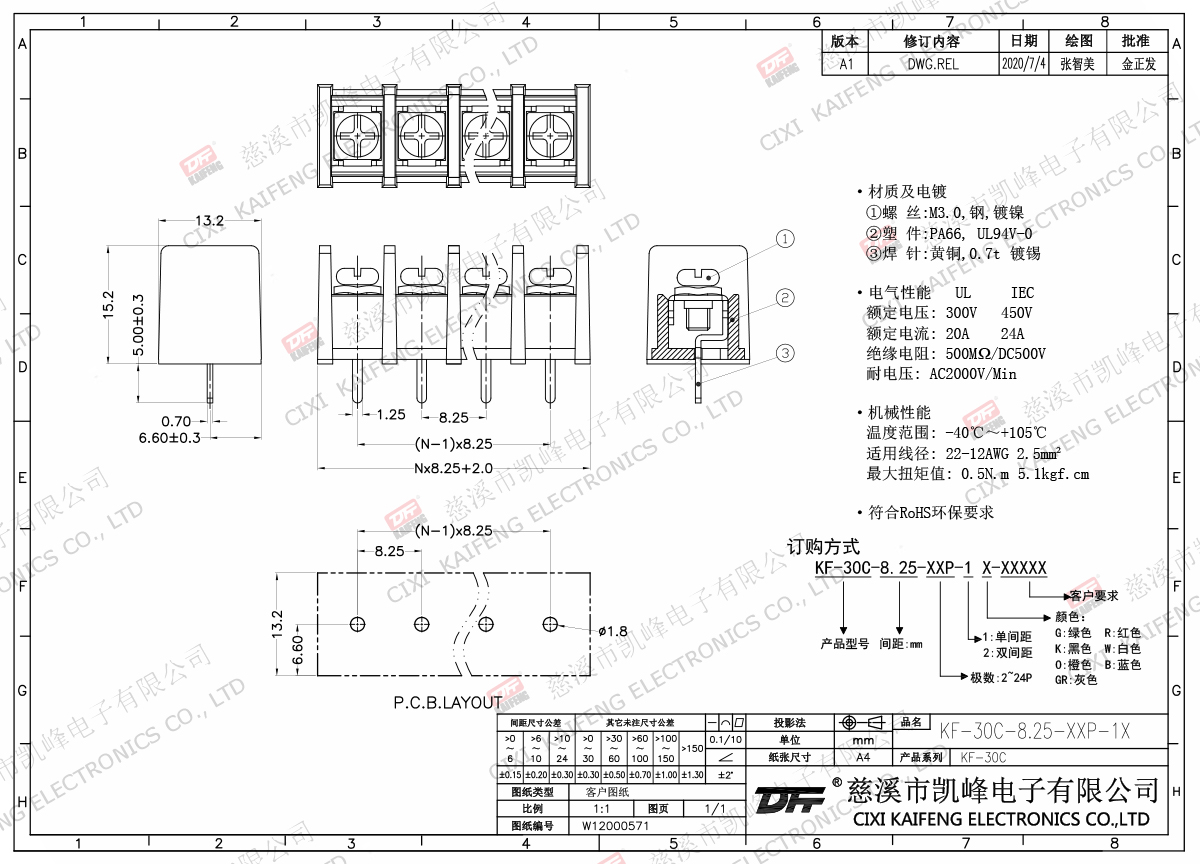 材質(zhì)電鍍:M3.0 鋼,鍍鎳端子:黃銅,0.7t 鍍鎳塑件: PA66,UL94V-0電氣性能ULIEC額定電壓300V 450V 額定電流15A24A絕緣電阻500MΩ/DC500V耐電壓AC2000V/1min使用線徑22-12AWG 2.5mm2機械性能溫度范圍-40℃~+105℃ 扭矩0.5N.m 4.4Lb.in