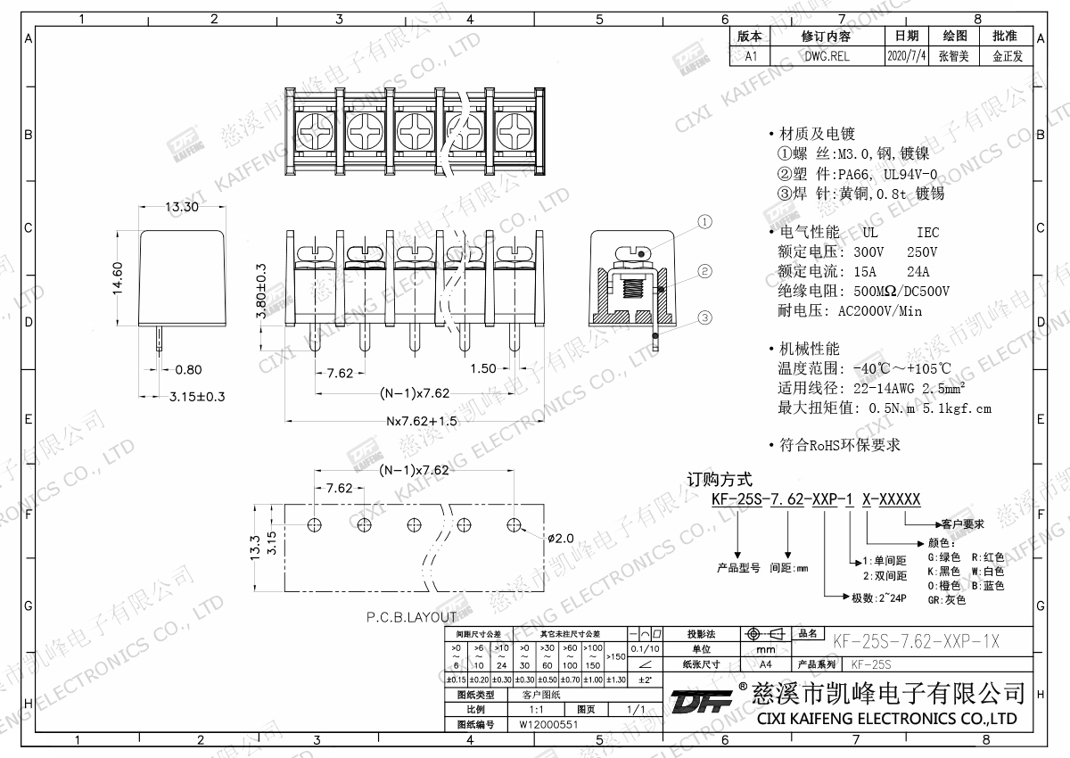 柵欄式接線端子 材質(zhì)電鍍:M3.0 鋼,鍍鎳端子:黃銅,0.8t 鍍鎳塑件: PA66,UL94V-0電氣性能ULIEC額定電壓300V 250V 額定電流15A24A絕緣電阻500MΩ/DC500V耐電壓AC2000V/1min使用線徑22-14AWG 2.5mm2機(jī)械性能溫度范圍-40℃~+105℃ 扭矩0.5N.m 4.4Lb.in