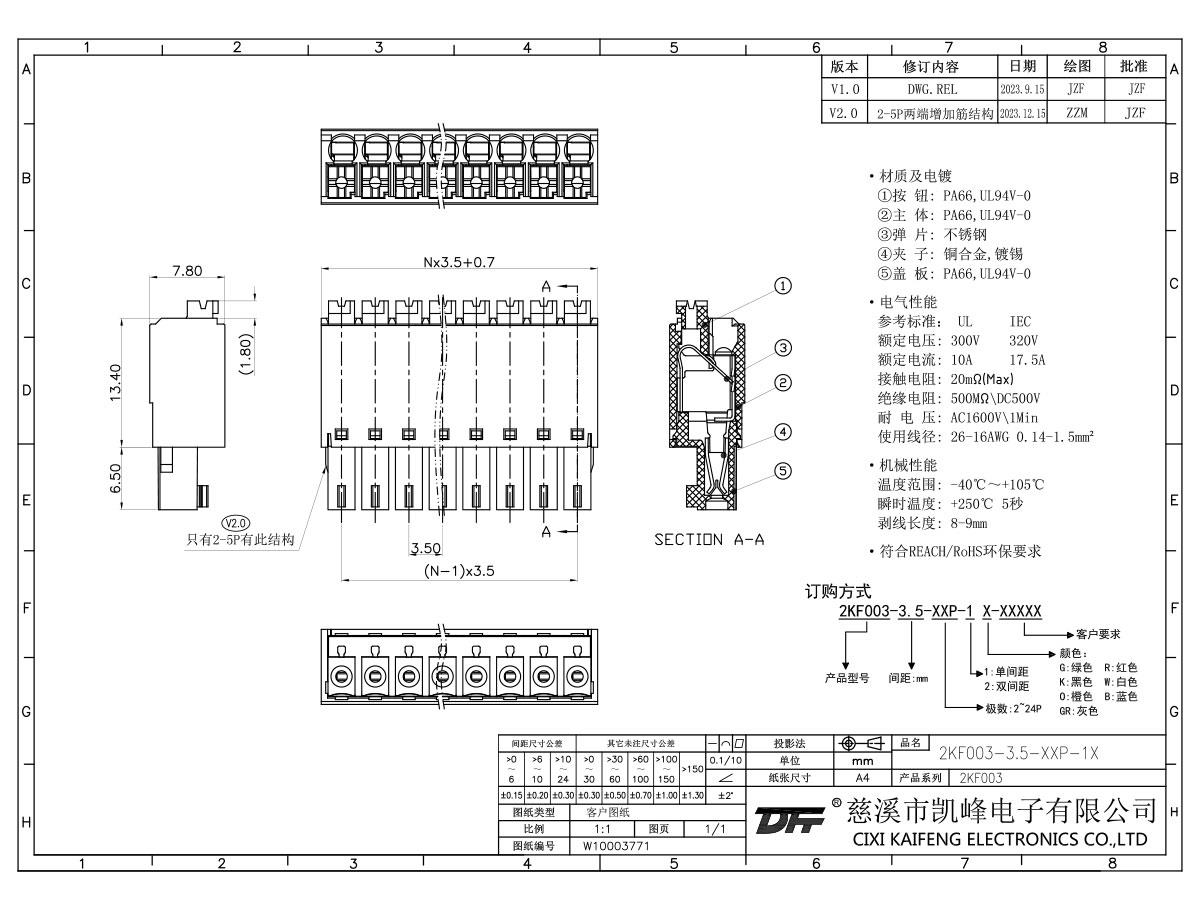 插拔式連接端子 材質(zhì)電鍍:①彈片:PA66,UL94V-0 ②夾子 : 不繡鋼3 按鈕:磷青銅電氣性能UL IEC 額定電壓300V 320V &
