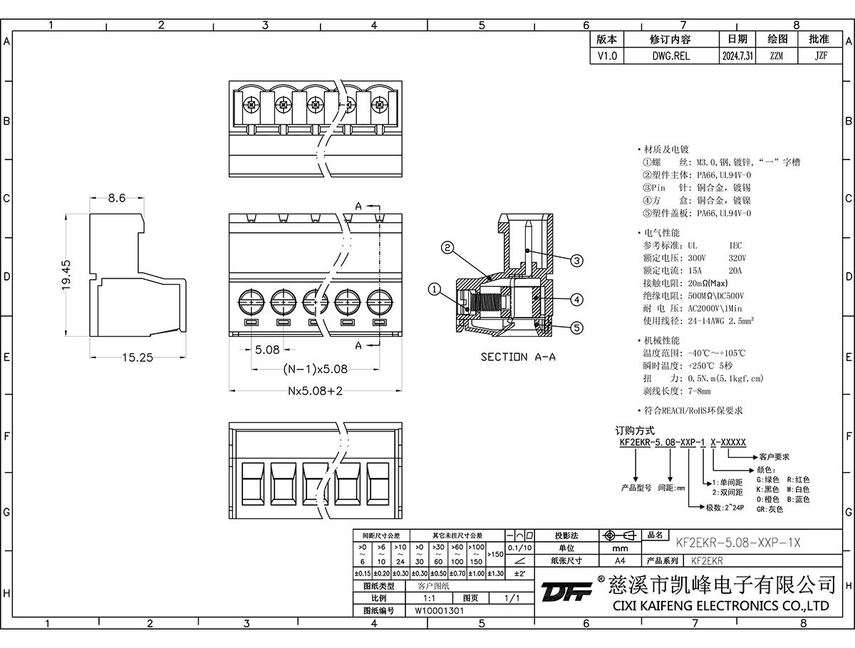 材質電鍍:材質及電鍍螺絲: M3.0,鋼,鍍鋅觸點: 磷青銅焊針: -塑件: PA66,UL94V-0電氣性能ULIEC額定電壓300V 320V 額定電流15A20A接觸電阻20mΩ絕緣電阻500MΩ/DC500V耐電壓AC2000V/1min使用線徑24-14AWG 2.5mm2機械性能溫度范圍-40℃~+105℃ 瞬時溫度+25